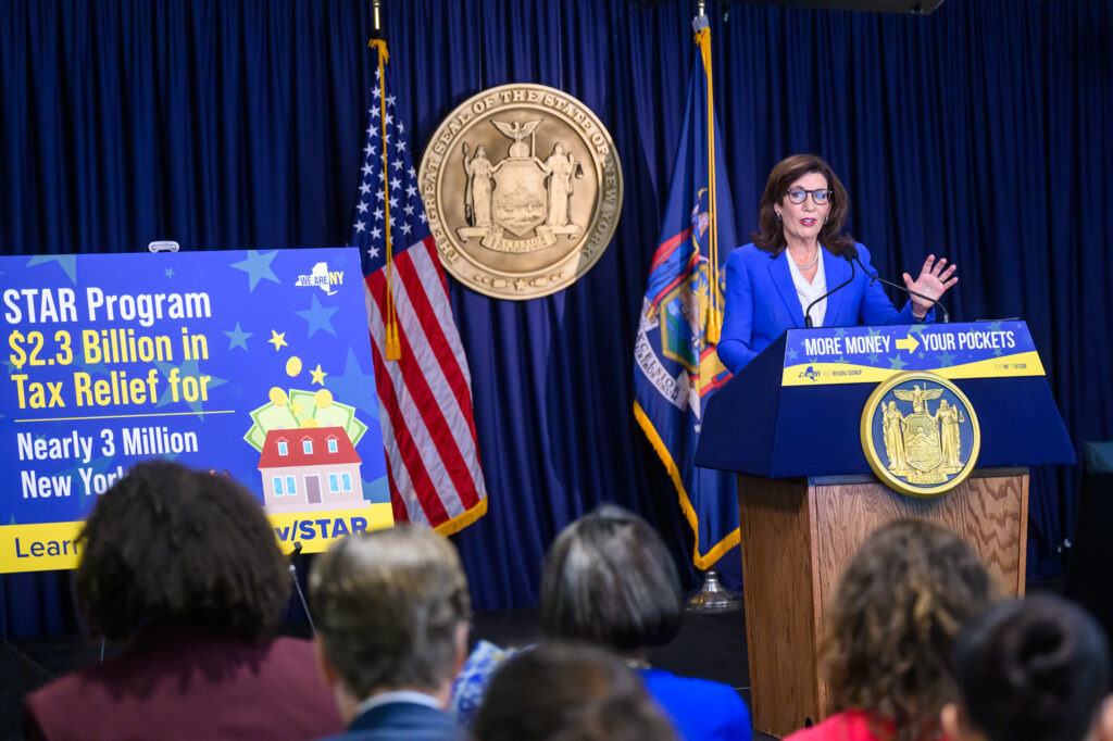 La gobernadora de Nueva York, Kathy Hochul, presentando el presupuesto anual en una conferencia reciente.