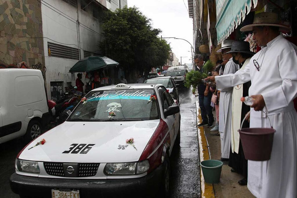 En vísperas de la celebración de la Asunción de la Virgen María, patrona de la Catedral de Chilpancingo, capital de Guerrero, transportistas y sus familias realizaron una caravana en la parte trasera de esa iglesia, donde un sacerdote y diáconos rociaron agua bendita sobre ellos y sus unidades mientras pasaban.