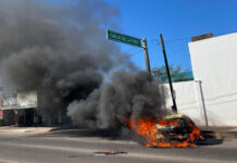 Vista de un vehículo calcinado hoy tras los enfrentamientos de fuerzas federales con grupos armados, en la ciudad de Culiacán, estado de Sinaloa (México)....