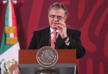 El secretario de Relaciones Exteriores de México (SRE), Marcelo Ebrard, habla durante una rueda de prensa del presidente Andrés Manuel López Obrador en Palacio...