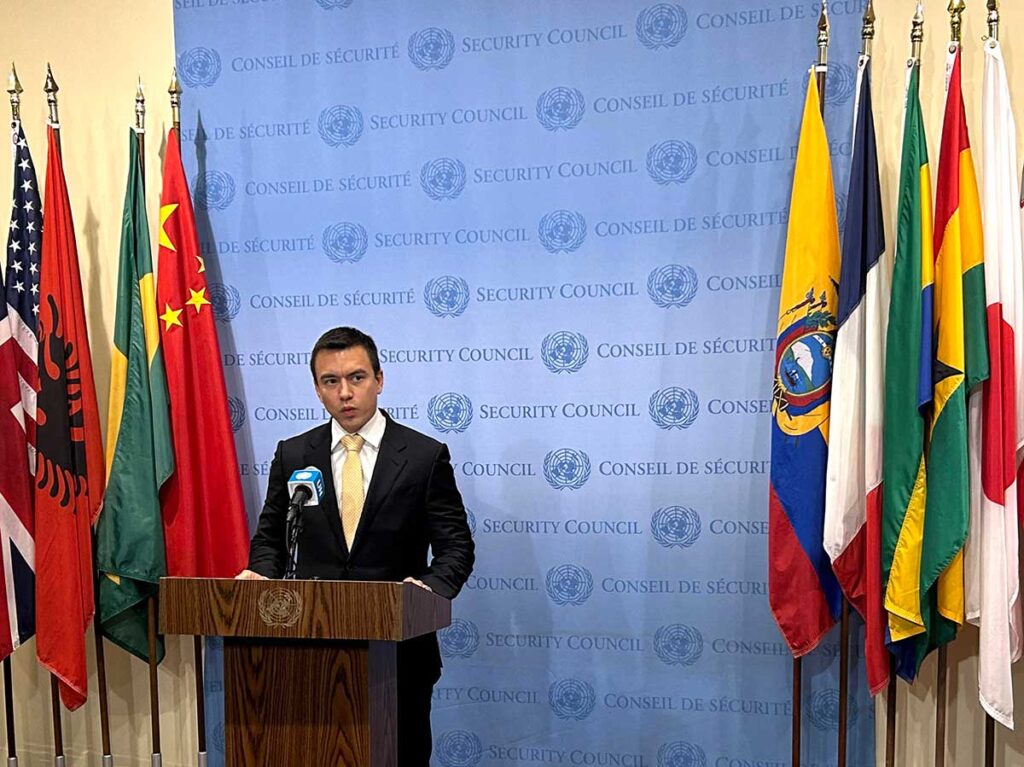 Noboa presidió hoy una sesión del Consejo de Seguridad sobre la delincuencia transfronteriza, y ofreció una rueda de prensa posterior en la que dio a entender que su país se opone a los planes de Venezuela de anexionarse el Esequibo.