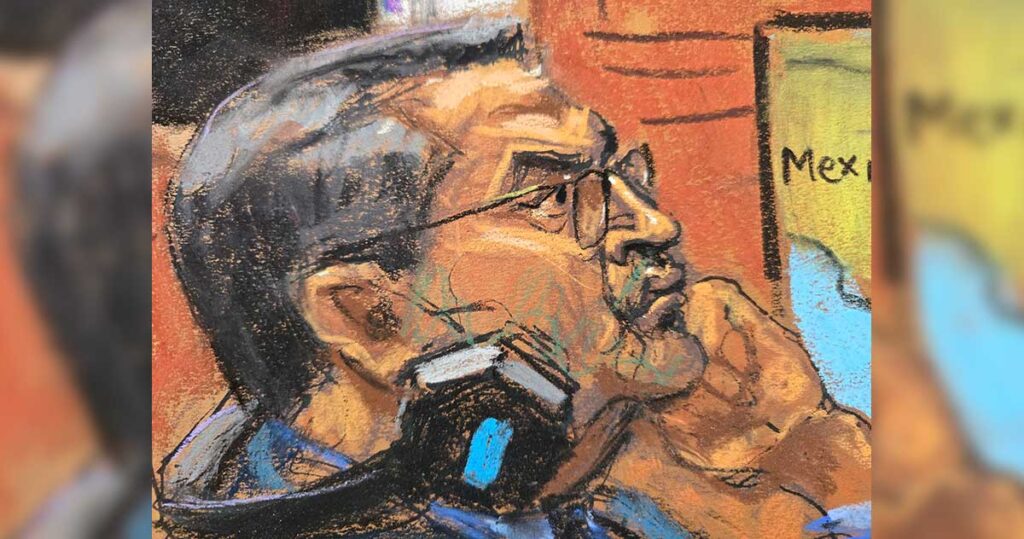 Reproducción fotográfica de un dibujo realizado por la artista Jane Rosenberg donde aparece el expresidente de Honduras Juan Orlando Hernández (2014-2022) mientras escucha los alegatos de la fiscalía, este miércoles durante su comparecencia ante la justicia en un tribunal federal en Nueva York (Estados Unidos). EFE