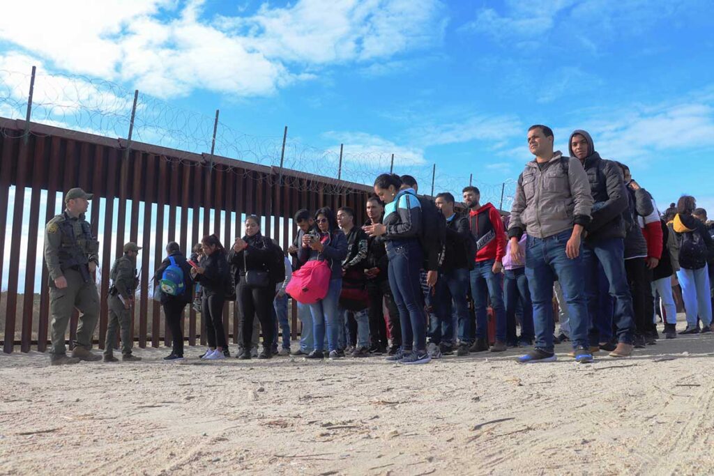 Patrulla Fronteriza estadounidense mantienen en filas organizadas a un grupo de migrantes. EFE