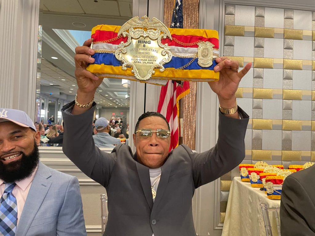 Mientras, en Nueva York, la Veteran Boxers Association Ring 8 lo metió en su Clase 2026 junto a otros inmortales. La placa que recibió dice: “RING 8 New York State Boxing Hall of Fame, Clase 2026, JULIO CÉSAR GREEN, Ceremonia 19 de abril 2026”.