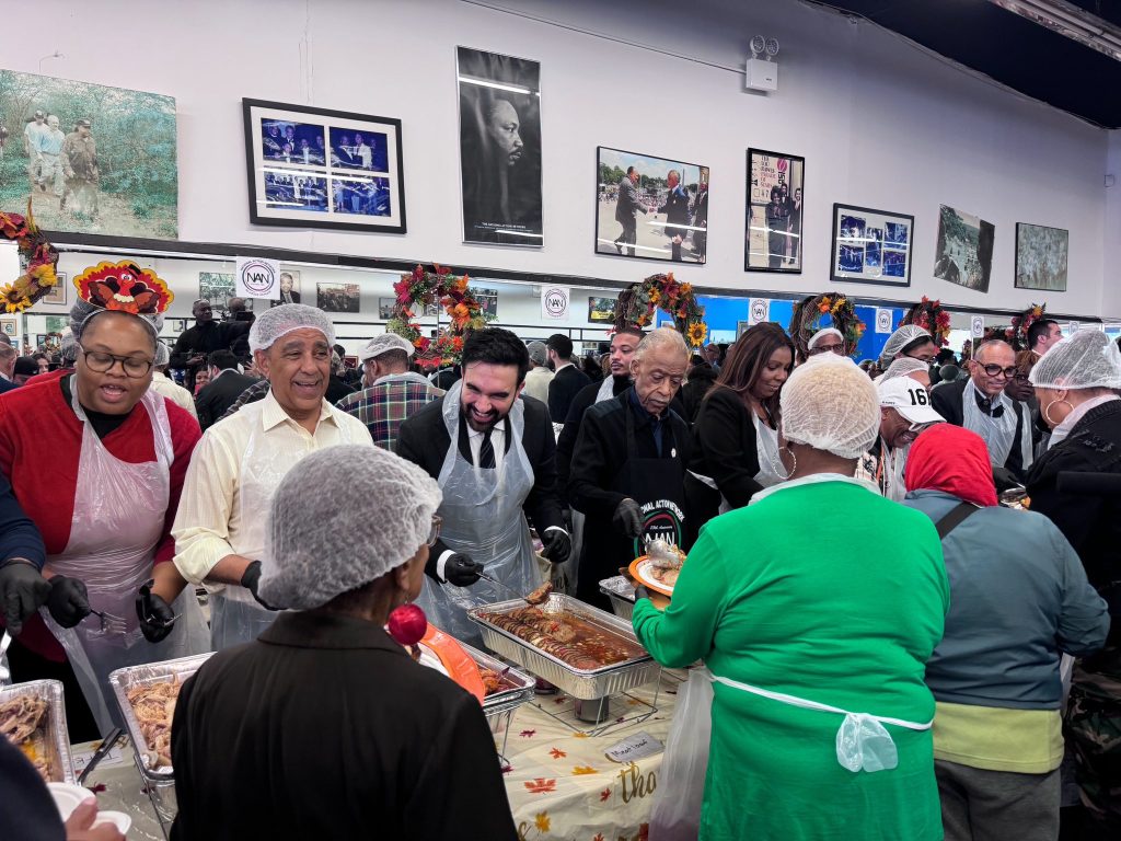 El alcalde electo Zohran Mamdani participó de una cena solidaria para los necesitados, en Acción de Gracias, acompañado de lideres como Al Sharpton y el congresista de Nueva York, Adriano Espaillat, entre otros. Foto ZM