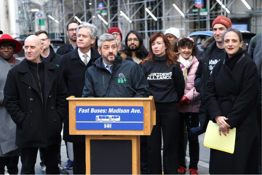 La vicealcaldesa de Operaciones de la ciudad de Nueva York, Julia Kerson, y el comisionado del Departamento de Transporte de la ciudad de Nueva York (NYC DOT), Mike Flynn, anunciaron ayer que la agencia completará un proyecto de rediseño vial que se encontraba paralizado, extendiendo los carriles exclusivos para autobuses en la avenida Madison de Manhattan, desde la calle 42 hacia el sur hasta la calle 23.