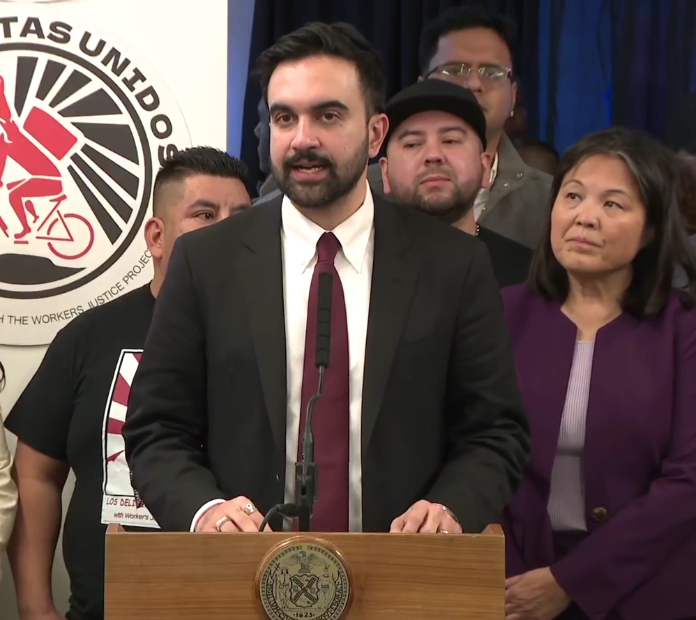 El alcalde Zohran Mamdani se unió a la vicealcaldesa de Justicia Económica, Julie Su; al comisionado del DCWP, Sam Levine; y a defensores del Worker’s Justice Project y Los Deliveristas Unidos para anunciar la demanda.