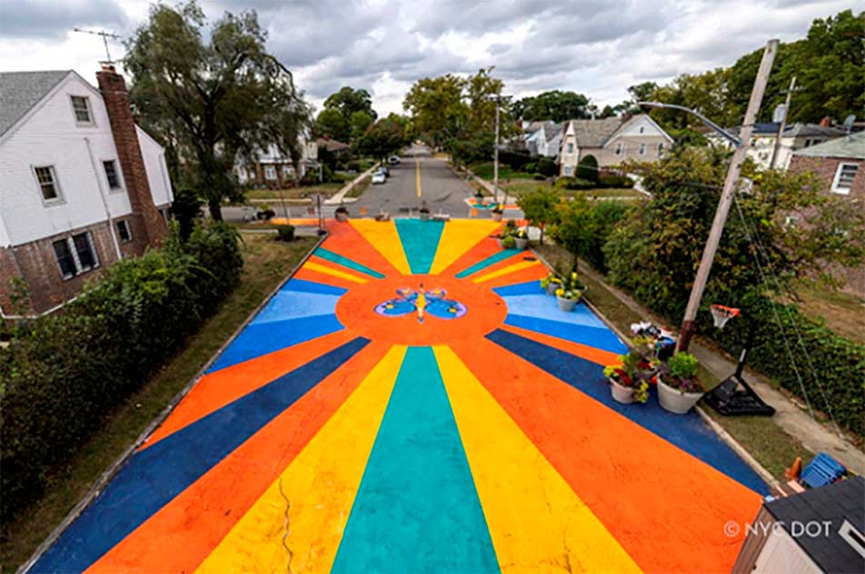 Un vibrante mural de arte asfáltico, titulado Magnify ¡Legado! Triumph!, en la nueva plaza peatonal en Murdock Avenue Open Street en Addisleigh Park, Queens. Crédito: DOT de Nueva York