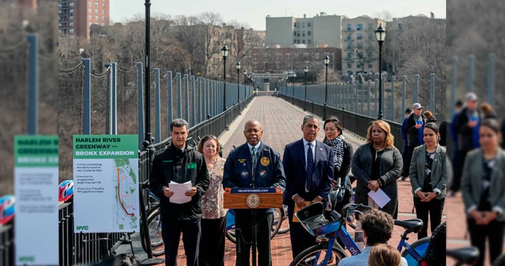 El alcalde Eric Adams, y el comisionado del DOT, Ydanis Rodríguez, anunciaron en conferencia de prensa sobre los talleres para que el público ofrezca sus puntos de vista sobre la nueva vía de Harlem River Greenway.