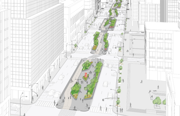 El rediseño implicaría la eliminación de un carril de circulación en cada sentido, lo que permitiría ampliar las medianas para albergar asientos, vegetación y comodidades para peatones y ciclistas. Una mediana típica podría incluir zonas ajardinadas, un carril bici norte-sur y un sendero peatonal.
