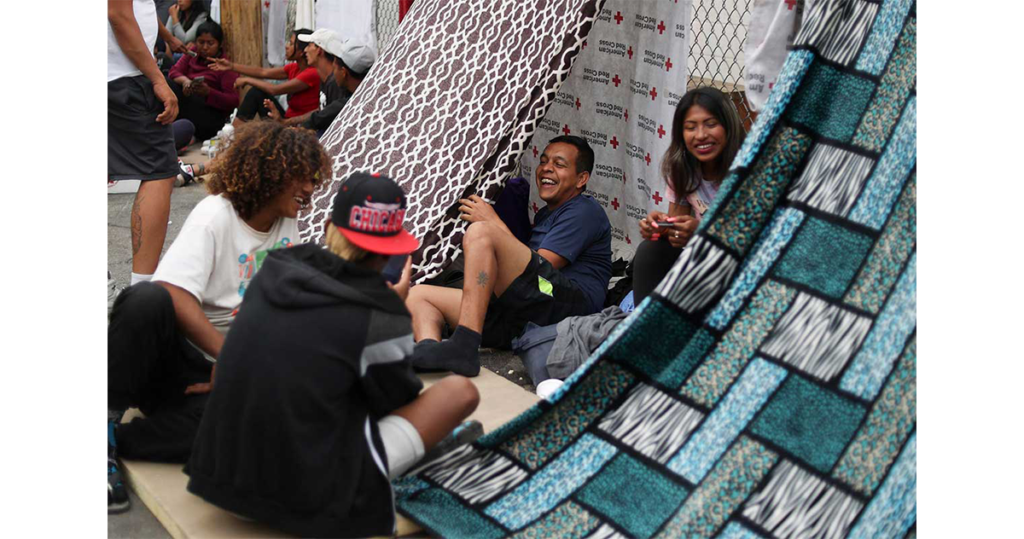 Inmigrantes que esperan en una acera, en una zona acondicionada para migrantes que cruzan desde México, en los alrededores de la iglesia Sagrado Corazón, en el área central de la ciudad fronteriza de El Paso, Texas. EFE