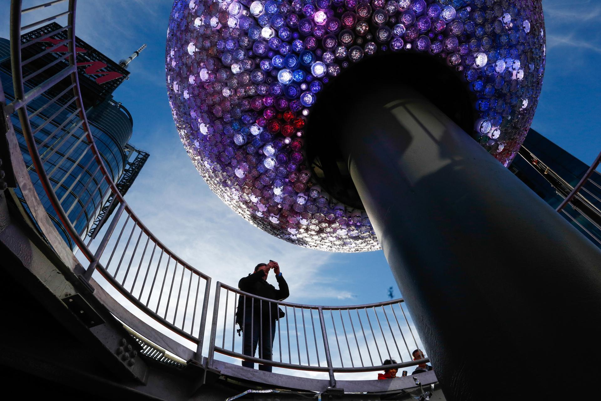Una persona toma una foto de el nuevo diseño de la bola de cristal de Times Square. Foto EFE